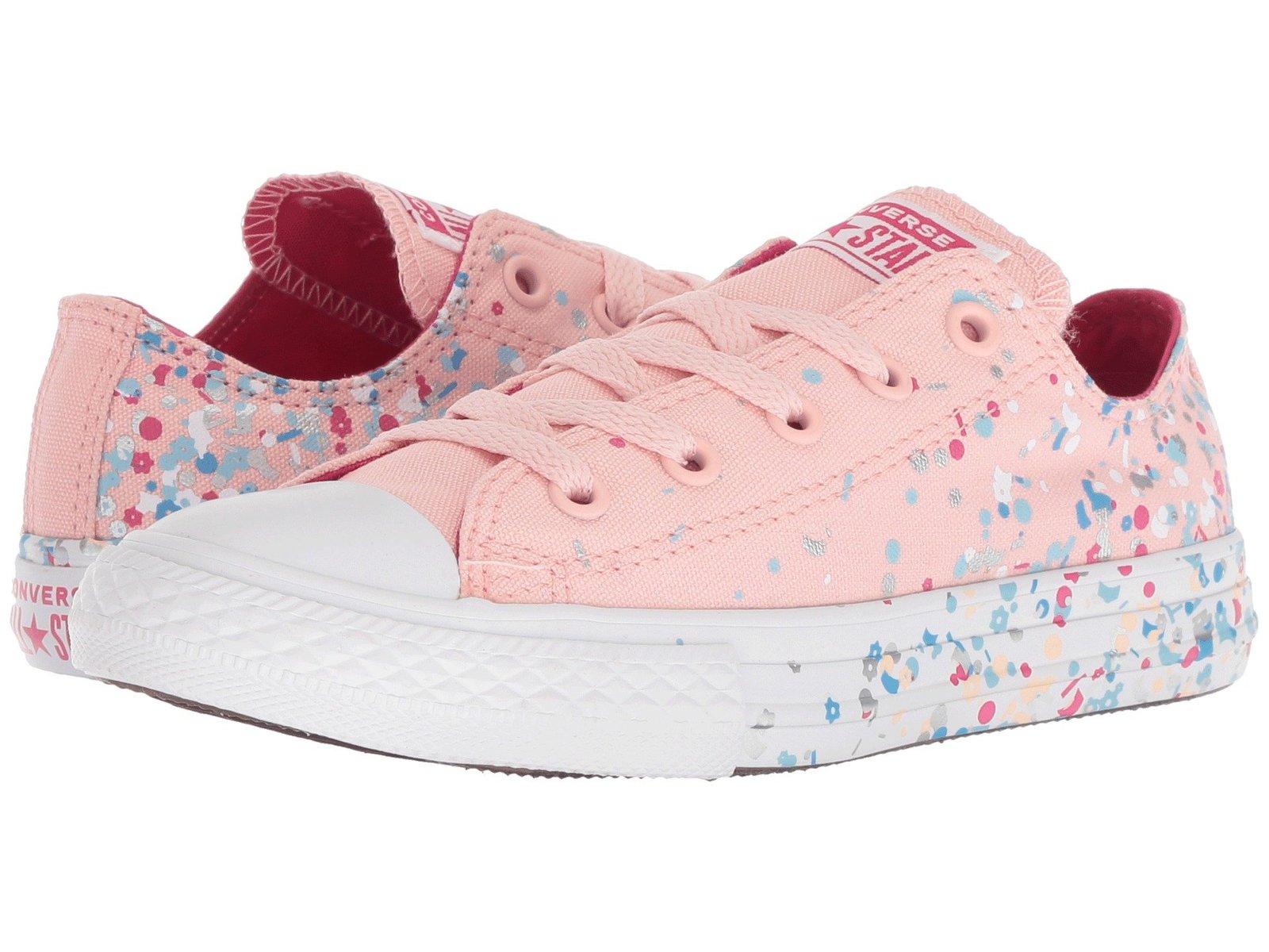 From sweet summer sundresses to casual cutoffs, the classic Converse® Kids Chuck Taylor® All-Star® Confetti – Ox is all dressed up and ready to party! Classic canvas upper with tonal stitching and colorful screened confetti accent at heel quarter. Lace-up closure for a secure fit. All Star® patch at tongue. Smooth textile lining for comfort. Logo detailing at back heel. Vulcanized midsole provides cushion and style. Iconic rubber toe cap for instant recognition. Durable rubber outsole provides a long wear and excellent flexibility. Imported. Product measurements were taken using size 6 Big Kid, width M. Please note that measurements may vary by size. Weight of footwear is based on a single item, not a pair. Measurements: Weight: 9 oz
